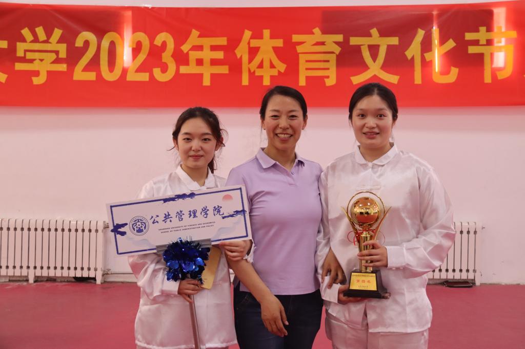 比赛开始,各学院按抽签顺序依次上场,公共管理学院代表队作为第三个队伍上场。队员们按照3×3的队列上场,面向评委席中间,以特殊队形散开,站定,向观众和评委敬礼。随着音乐响起,队员们入境放松,展示了急缓相间,行云流水的太极拳术,意、气、形、神逐渐融为一体,可谓“妙手一运一太极,太极一运化乌有”。经过评委打分,学院获得团体“第四名”的好成绩,孙欣宜获“最佳个人奖”。