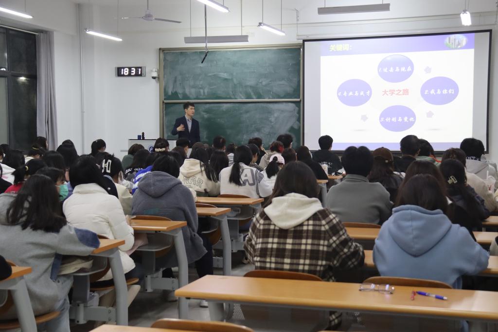 随后,曲衍波从“过去与现在”、“我与你们”、“计划与变化”、“专业与成才”四个关键词向同学们讲解“如何走好大学路”。他联系学生现状,通过事例提醒各位同学成长要有计划,成才更要坚持。通过现场调研,他向同学们说明大学成长路其实是一个现状评估——过程管理——目标实现的过程,激励各位同学成为目标明确、勤于思考、善于学习的优秀学子,并为同学们讲解了制定计划的方法,其中强调了变化为计划带来的影响以及如何结合实际调整计划。