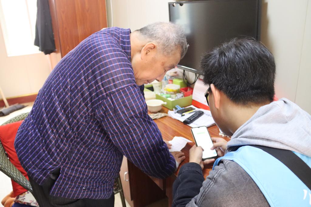 下午,志愿者们前往刘焕峨爷爷的房间,教老人使用手机。刘焕峨爷爷虽年事已高,仍然充满对新事物的好奇。在志愿者们耐心认真的指导下,他逐渐掌握了发消息、看视频、听音乐等功能的用法。