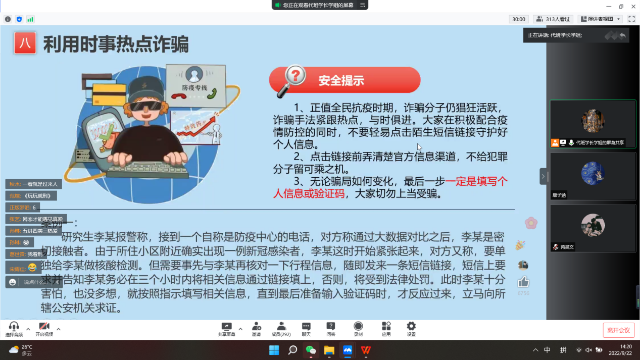 会议初始,向新同学介绍了学校的各项纪律以及课程及学分的重要性,帮助新生较快适应大学学习方式;其次强调疫情防控的重要性,做到共防时疫,共赴未来;接下来通过展示电信网络诈骗的警示案例,提高同学们的网络防诈骗意识,充分保护自己的人身财产安全;随后新生代班为同学们点出消防安全的几点隐患,杜绝火灾的发生;接着在出行与社团方面介绍如何规划外出路线和丰富同学们的课余生活;最后,代班向同学们介绍了各种考证学习与活动竞赛,帮助大家在大学时期提升自我,丰富履历。