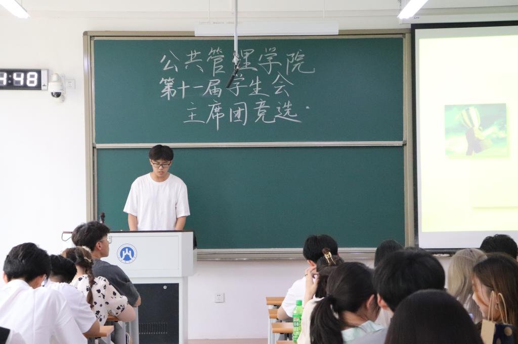 (通讯员 张诗怡 摄影 周蓝梦 谢圆圆)6月2日下午一点半,公共管理学院第十一届学生会主席团竞选于圣井校区8212教室顺利召开。会议由学生会副秘书长邹光天主持,院党委副书记王坤、学工办主任张辉、团委书记王超、辅导员韩步彤出席,我院14位学生会干事参与竞选,全体学生会成员以线上线下相结合的方式共同参加。