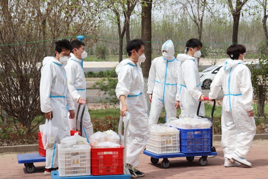 在接到送餐任务要求后,我院积极响应,由辅导员张辉、韩步彤进行组织安排。4月8日晚,公共管理学院40名志愿者收到疫情防护服和口罩,其中防护服一餐一套,严格保障食品安全,口罩分配专用防疫口罩,确保志愿者安全。接着学院对40名志愿者进行分组,第1组20名同学去二号餐厅装车;第2组20名同学在宿舍楼门口卸车并且按学院分餐。