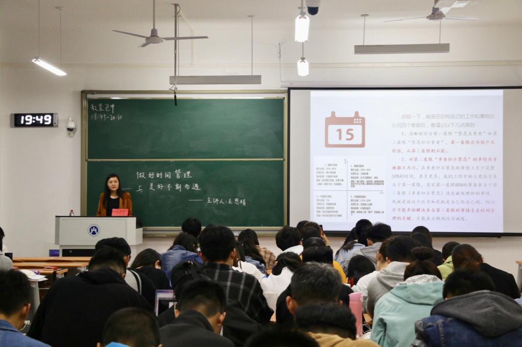 (通讯员 张雨 邵暄 摄影 谭诚)5月6日,我院开展了主题为“做好时间管理——与美好不期而遇”的讲座。此次讲座邀请我院团委书记王恩娟老师主讲,我院2018级学生积极参加。