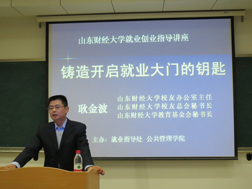 11月22日下午,由公共管理学院和山东财经大学就业指导处联合主办的“铸造开启就业大门的钥匙”就业指导讲座在燕山校区逸夫楼501举行。主讲人为山东财经大学校友办公室教育基金会主任耿金波。就业指导处处长苏洪志,公共管理学院党总支副书记周炎、就业指导处的相关老师出席了本次讲座。
