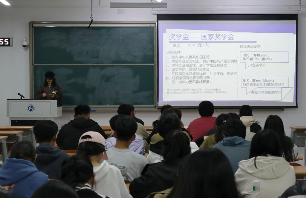 资助中心的同学细致严谨,通过PPT的形式向同学们介绍了奖学金、助学金、勤工俭学、生源地贷款、学费减免五项政策,并详细阐明了这几者的分类及申请标准。他们提醒同学们,申请奖学金与助学金,对学生自身学业成绩和平时表现情况也有较高要求,希望同学们在学习生活中以更高的标准要求自己。