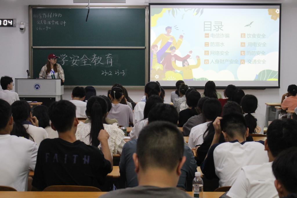 (通讯员 徐施宁 摄影 田怡帆 嵇朋乐)9月10日晚7点,为增强安全意识,提高同学们的自我保护能力,帮助新生更好地适应大学生活环境,公共管理学院“新生安全教育”活动在圣井校区8号教学楼顺利举行,该活动由新生代班、代团主持,全体2023级新生参与活动。
