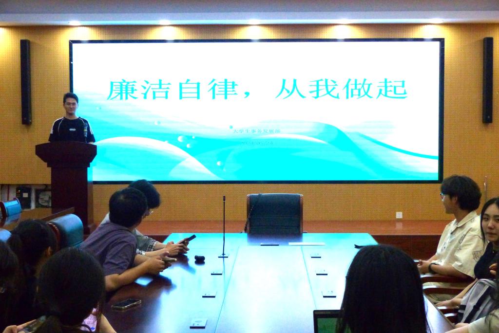 活动现场,大学生事务发展部的成员通过PPT讲演的形式,深入讲解廉洁文化的重要性和现实意义,并阐述了贯彻廉洁教育的重要性、实施策略与方法、面临的挑战与对策等。期间,全体学生会成员纷纷表示自己将在接下来的学习和工作中,提高自身的廉政素养,不将个人利益凌驾于集体利益之上,遇事讲原则,办事讲标准、讲程序,明确自身职责,敢于坚持正确的立场和主张。
