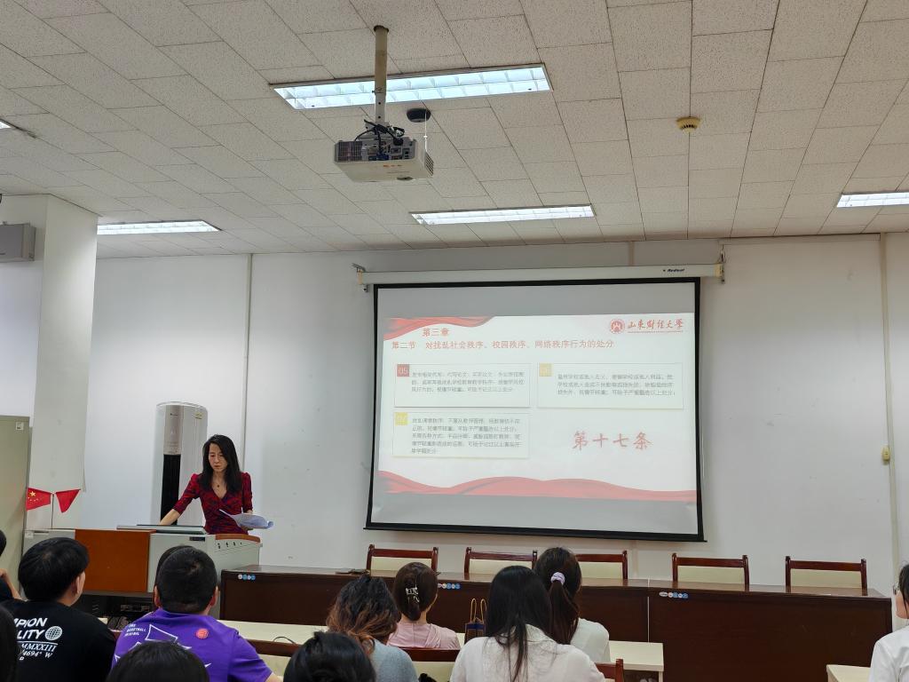 为贯彻落实学校第二次党代会精神,推动党纪学习教育走深走实,增强研究生的纪律意识,打造良好院风、学风,5月30日下午,2022级研究生在燕山校区4407召开了《山东财经大学违纪处分条例》学习主题班会。班会由辅导员李昭娜主持。