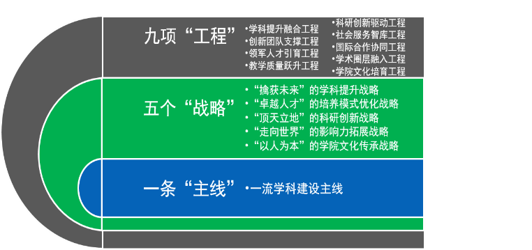 以一流学科建设为主线,驱动五大战略、实施九项工程,带动学院整体发展。